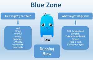 When you’re in the blue zone you may be feeling down – sad, sick, tired, or bored. You’re still in control, as you are in the yellow zone, but with low energy emotions.